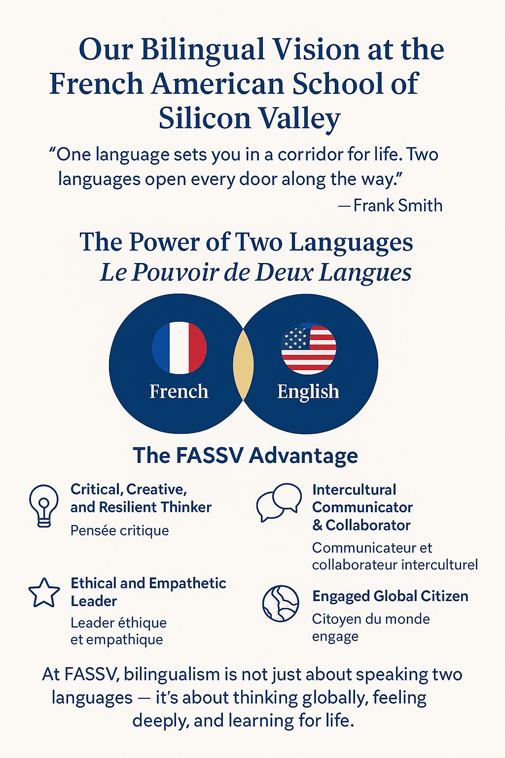 At the French American School of Silicon Valley (FASSV), bilingual education is more than learning two languages. It’s an invitation to think critically, lead confidently, and live with curiosity and compassion. We believe that the ability to learn, reason, and create in both French and English gives children a distinct lifelong advantage. It sharpens intellect, fuels imagination, and opens the mind to the world’s many ways of knowing and being.